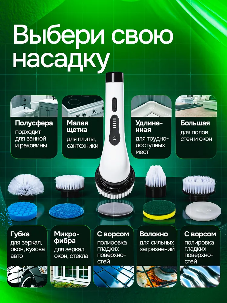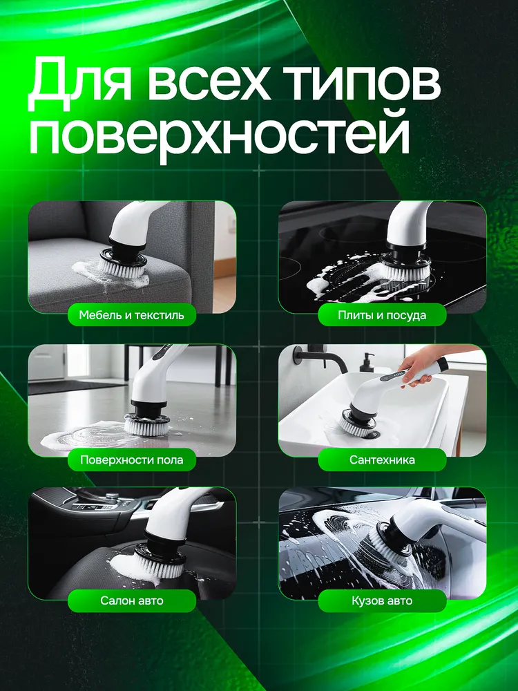 Электрощётка отлично подходит для ежедневной уборки, генеральной чистки и быстрой поддерживающей уборки без лишней химии. Это идеальный выбор для дома, квартиры, дачи и автомобиля.