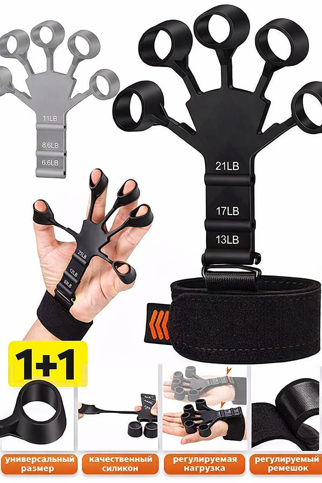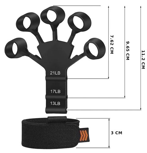 Тренажер для пальцев сделан из качественного силикона и при должном уходе прослужит длительное время. Эспандер для кисти оснащен качественным ремешком, который регулируется и подходит для запястий любых размеров. Длина эспандеров 11,5 см, а ширина 10,5 см. Диаметр отверстия для пальцев 2 см.