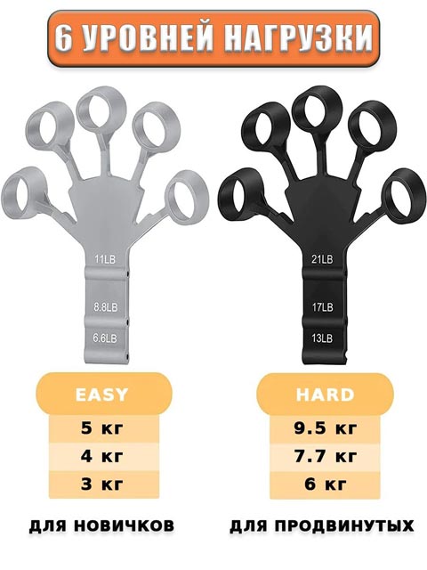 Эспандер для предплечья имеет 6 уровней сложности и подходит как для людей со слаборазвитыми мышцами пальцев, так и для сильных спортсменов с развитой "хваткой".
