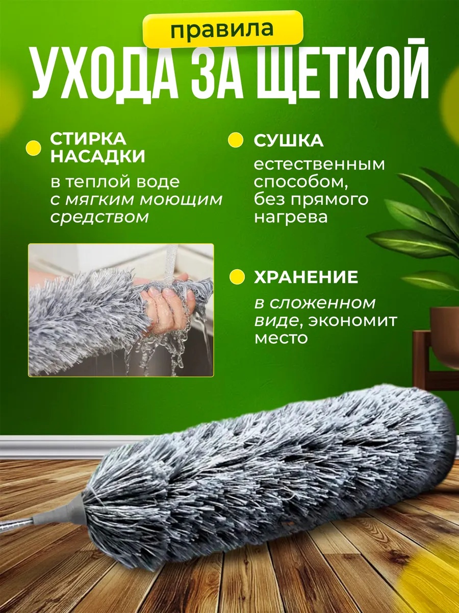 Антистатический ворс эффективно притягивает пыль, не разбрасывая её по комнате. Гибкая и длинная ручка избавляет от необходимости использовать стулья и лестницы, делая уборку безопаснее и комфортнее.