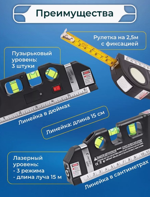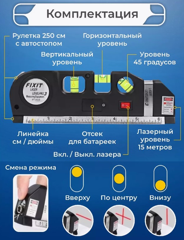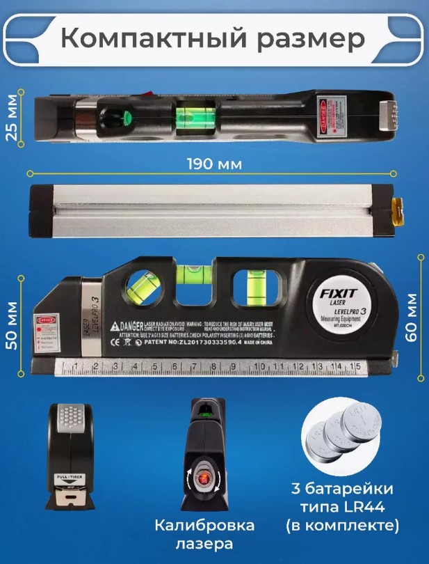 Удобство в использовании лазерного уровня подчеркивает встроенная рулетка длиной 2,5 метра, которая позволяет быстро и точно измерять расстояния, а также контролировать углы наклона. Корпус устройства изготовлен из ударопрочного ABS-пластика и алюминия, что гарантирует долговечность и надежность инструмента. Компактные размеры (19 см в длину и 6 см в ширину) позволяют легко носить уровень с собой, а его легкий вес делает его идеальным для использования в любых условиях.