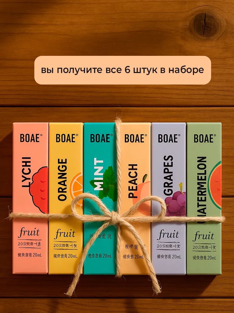 Освежители для рта BOAE — это стильное и удобное решение для поддержания свежего дыхания и гигиены полости рта. В набор входит 6 мини-спреев с разными вкусами: апельсин, личи, арбуз, виноград, мята и персик.