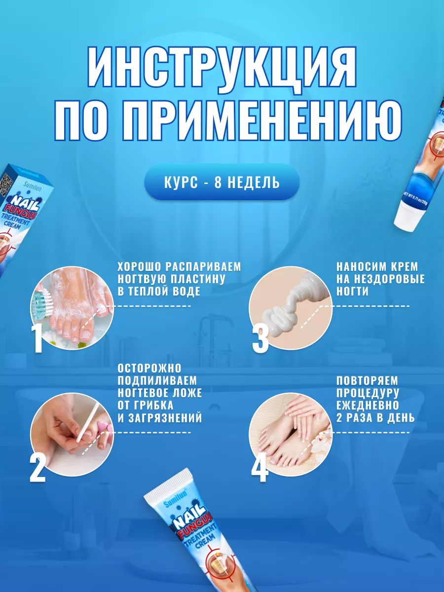 Наносите крем на чистые и сухие ногти дважды в день лёгкими массажными движениями, чтобы средство полностью впиталось. Курс всего 30 дней помогает вернуть ногтям естественный цвет, прочность и здоровую структуру. Чем раньше начнёте, тем быстрее увидите результат — закажите Sumifun прямо сейчас и почувствуйте облегчение уже после первых дней применения.