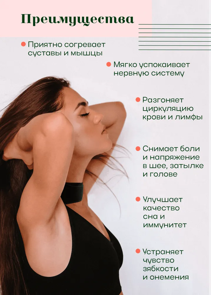Природный минерал турмалин начинает работать уже через 10–15 минут: вы почувствуете лёгкое комфортное тепло и расслабление. Регулярное использование улучшает подвижность шеи, помогает уменьшить усталость и повысить общий тонус.