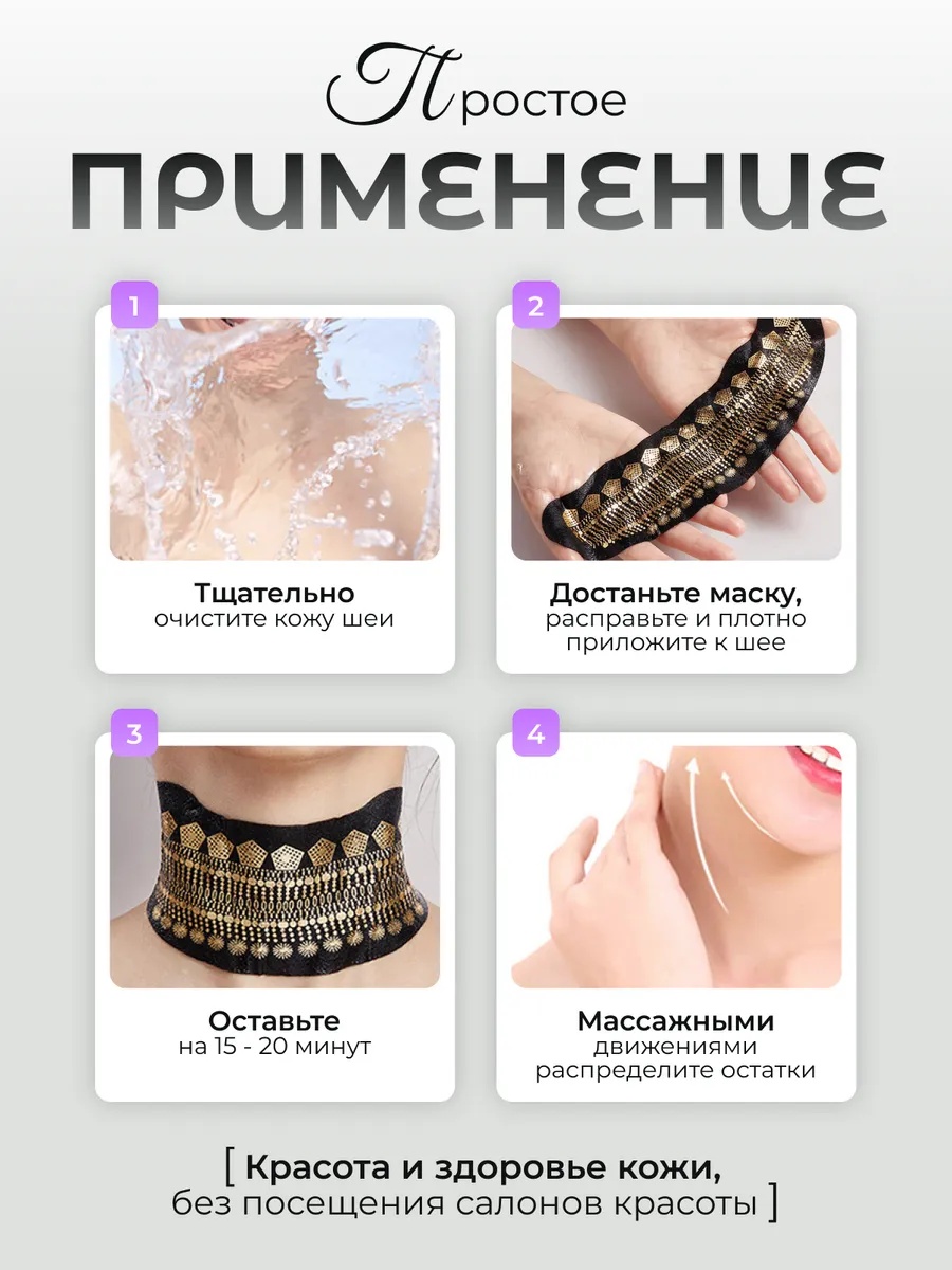Использовать маску просто: очистите кожу, нанесите маску на область шеи и оставьте на 15–20 минут. Для дополнительного охлаждающего эффекта можно подержать упаковку в холодильнике 2 минуты перед применением.