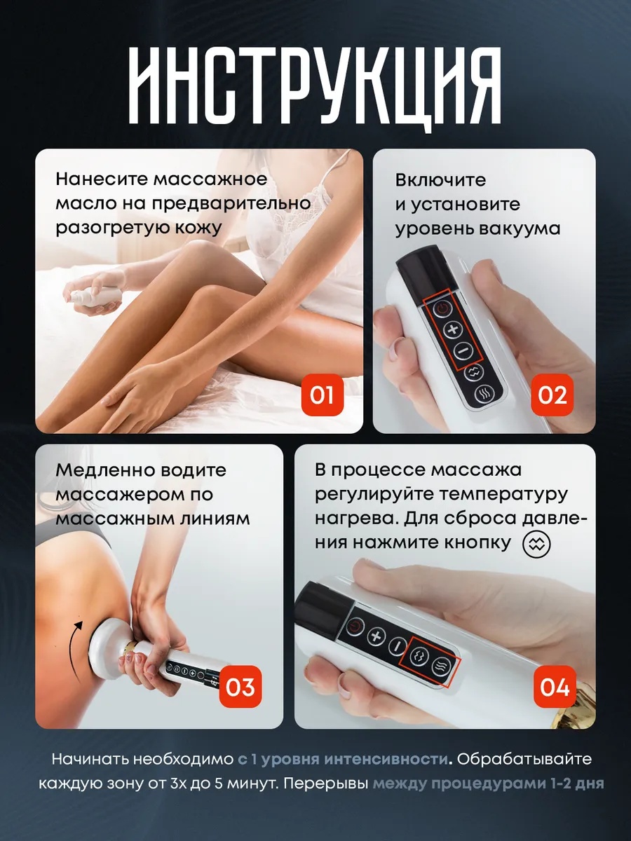 Он сочетает вакуумный массаж, инфракрасный прогрев и несколько режимов интенсивности для эффективной борьбы с целлюлитом, улучшения лимфотока и повышения упругости кожи.