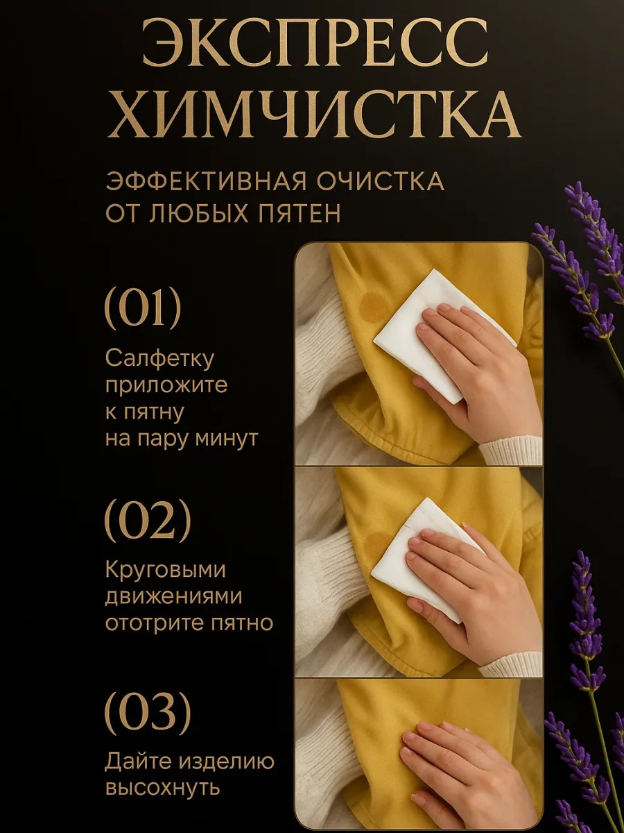 Салфетки для удаления пятен — это экспресс-средство, которое всегда под рукой. Они эффективно удаляют сложные загрязнения: кофе, вино, масло, кровь или грязь. Достаточно приложить салфетку на пару минут, протереть круговыми движениями и дать ткани высохнуть.