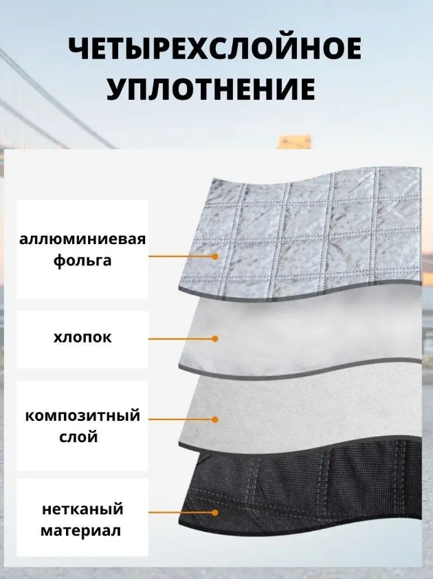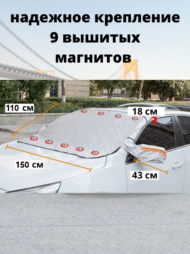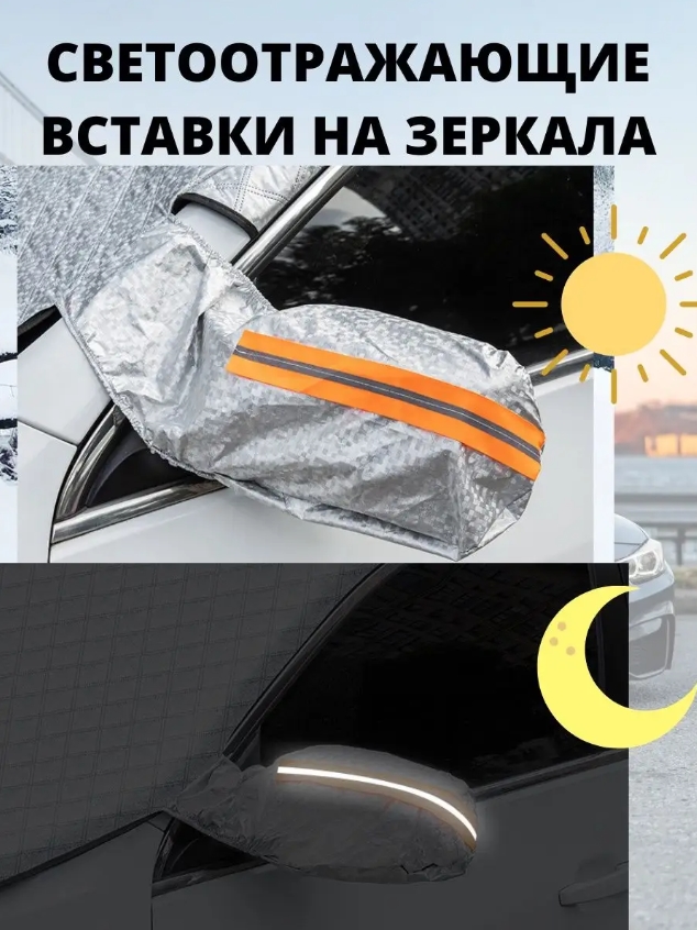 Светоотражающая накидка используется зимой и летом, легко крепится с помощью ушек - достаточно прижать ушки передними дверями. Накидка размером 150*110 см предотвращает примерзание снега к лобовому стеклу - вместо чистки нужно просто снять чехол на авто и отряхнуть его.