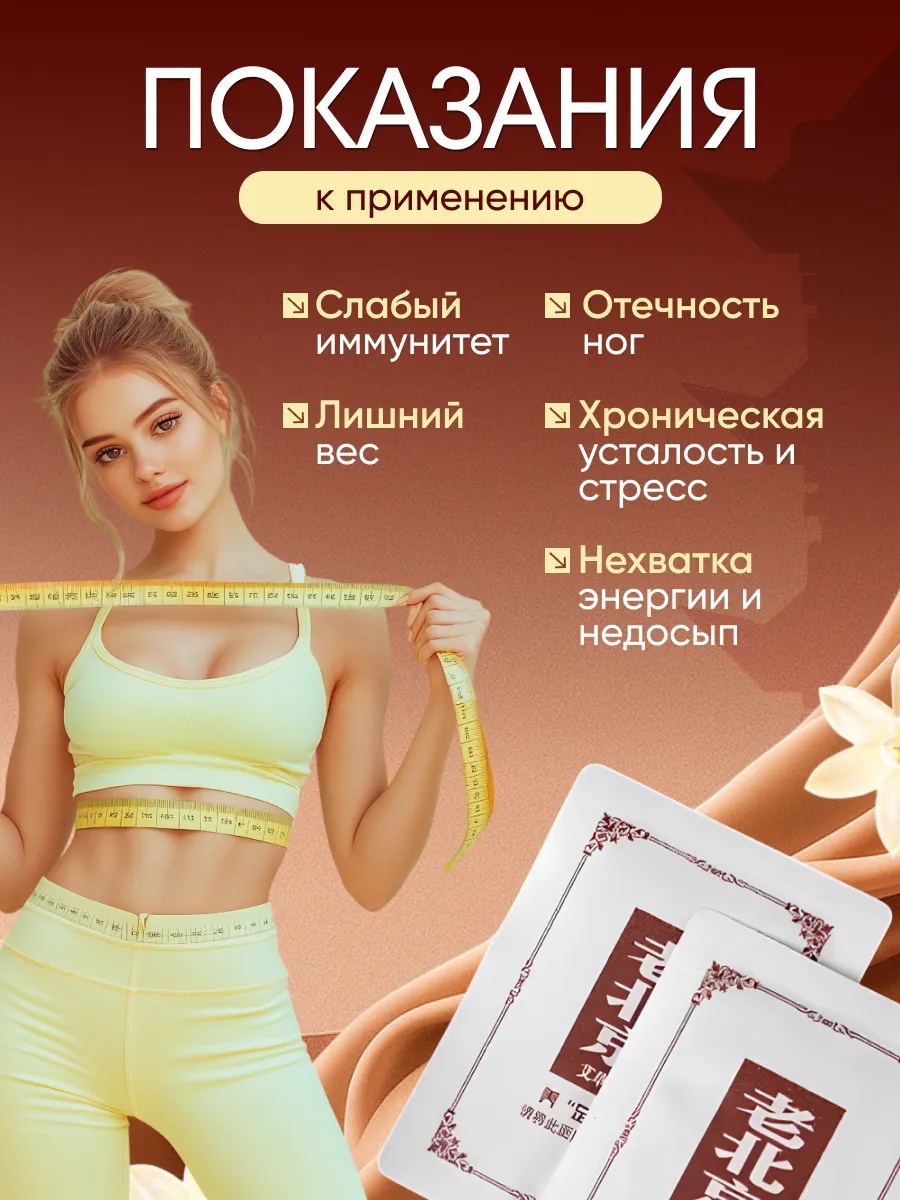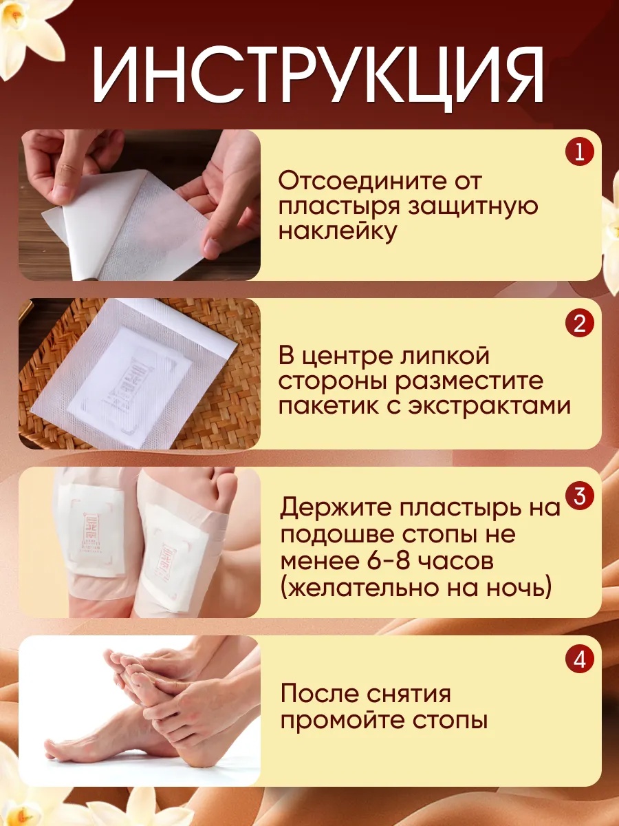 Пластырь наклеивается на стопы перед сном и работает всю ночь. Наутро вы почувствуете лёгкость и прилив энергии.