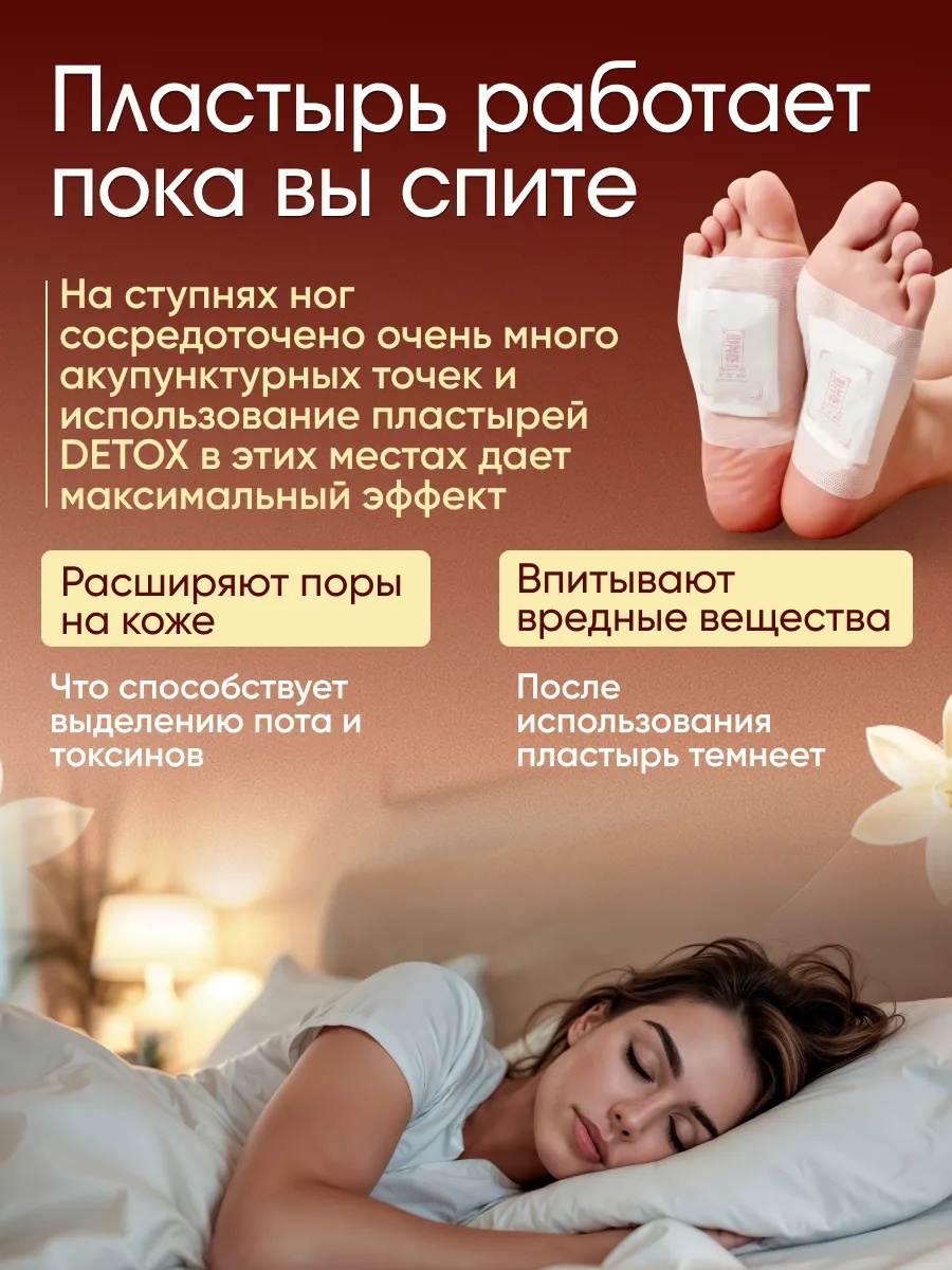 Детокс-пластыри для стоп – это натуральное средство для очищения организма и улучшения здоровья. В основе – бамбуковый уголь, китайская полынь, турмалин и витамин С, которые способствуют выводу токсинов, улучшению кровообращения и нормализации сна.