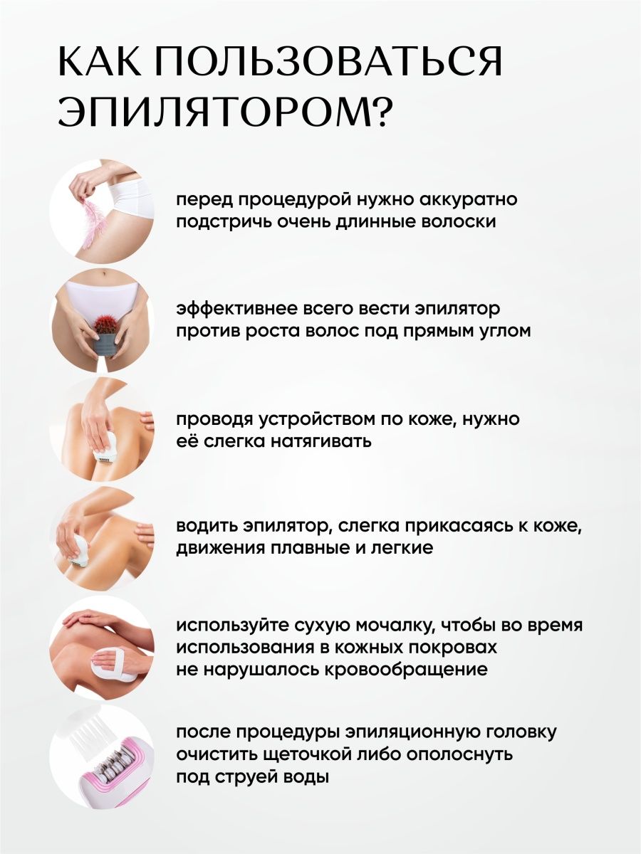 Легкий и компактный эпилятор сделает кожу идеально гладкой без раздражения. Эпилятор зарекомендовал себя, как достойная альтернатива таких брендов как philips, braun и rowenta. Благодаря бесконтактному воздействию на волоски исключает вероятность пореза и снижает раздражающие ощущения. Лезвия депилятора не кусают и не щиплют кожу, стальные ножи электробритвы безболезненно вырывают волоски, не оставляя следов, гладкость кожи сохраняется до 4-х недель.