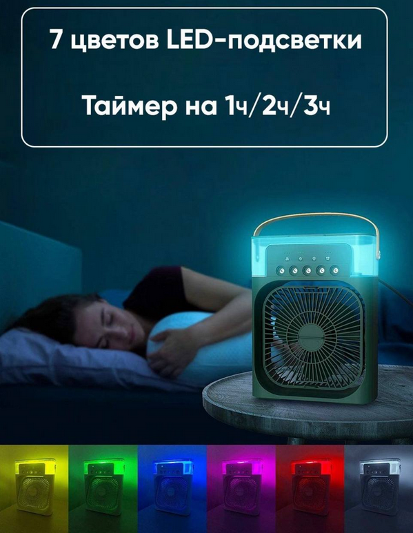 В нем есть режим подсветки-7 вариантов свечения, можно настроить по настроению или отключить совсем. Имеется также таймер, можно выставить время работы мини-кондиционера от 1 до 3 часов.