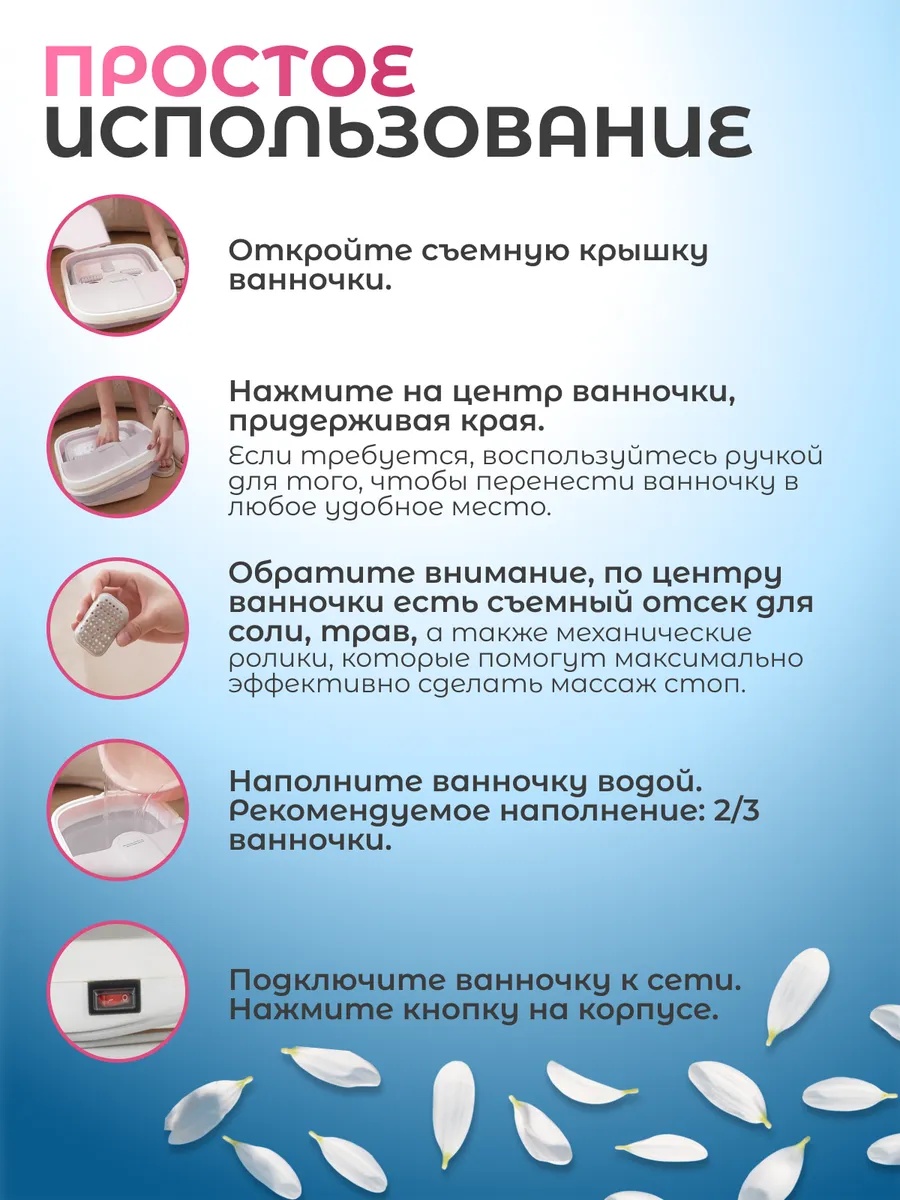 Встроенные ролики имитируют массаж галькой, улучшая кровообращение и снимая напряжение. Ванночка оснащена отсеком для морской соли и трав, что позволяет превратить обычную процедуру в настоящий СПА-ритуал.
