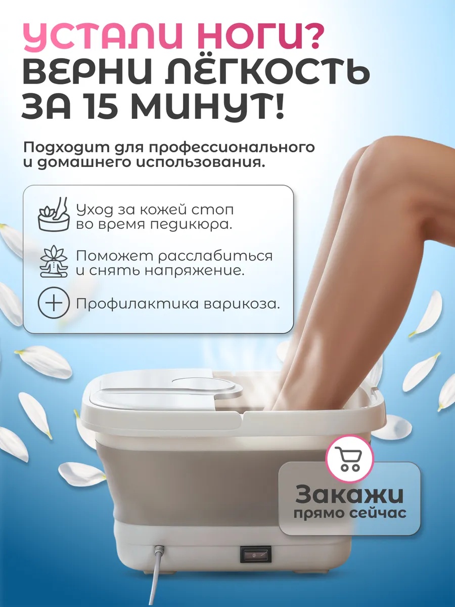 Складная SPA-ванночка для ног — это идеальное решение для тех, кто ценит красоту и здоровье. Устройство сочетает в себе гидромассаж, подогрев, светотерапию и микротоки, позволяя расслабить ноги после тяжёлого дня, устранить усталость и отёки.