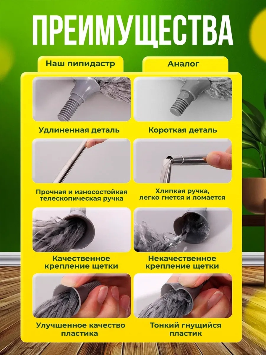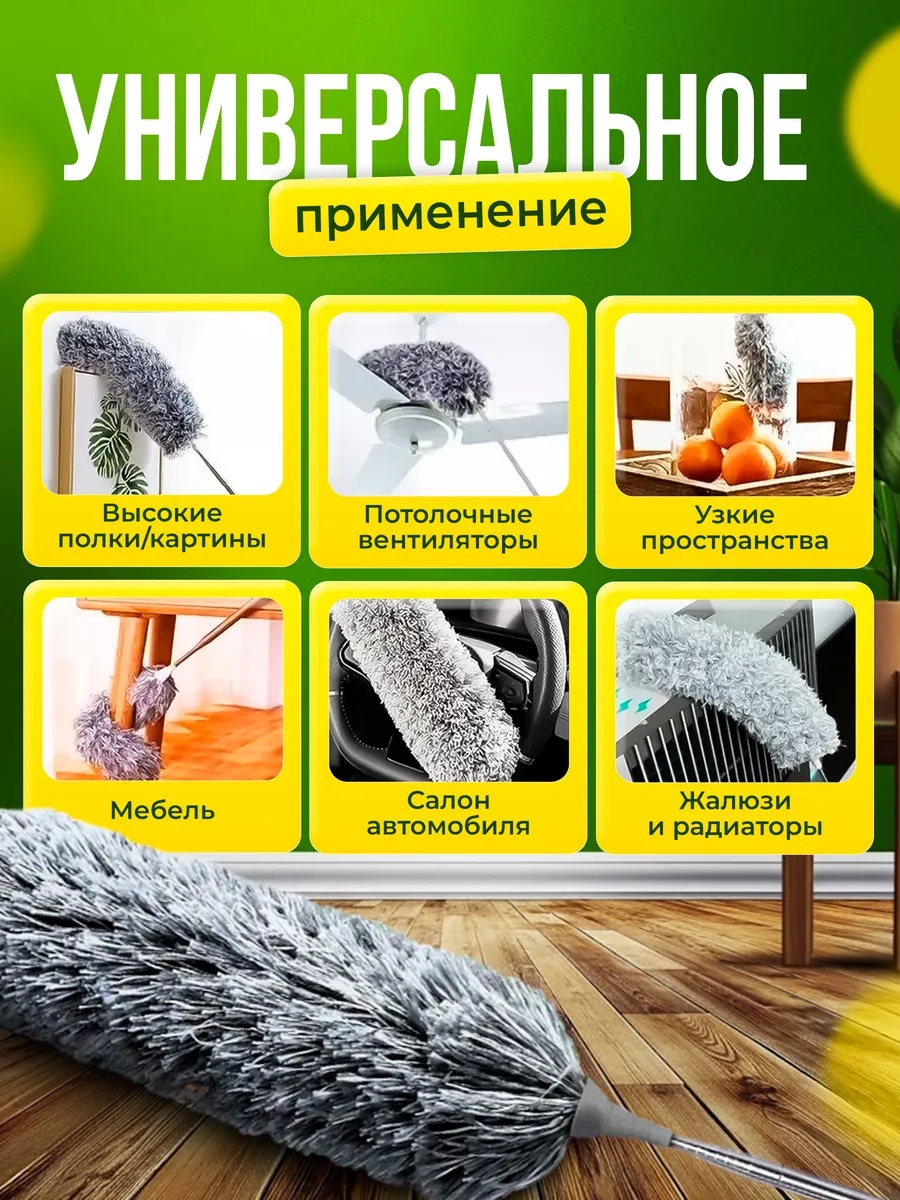 Пипидастр с телескопической ручкой — это удобный и практичный инструмент для быстрой и безопасной уборки дома. Он позволяет без усилий удалять пыль, паутину и загрязнения с высоких и труднодоступных поверхностей: потолков, люстр, карнизов, мебели, батарей и кухонной техники.