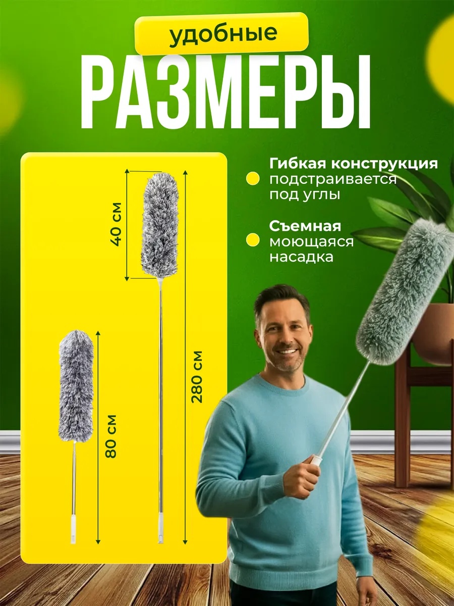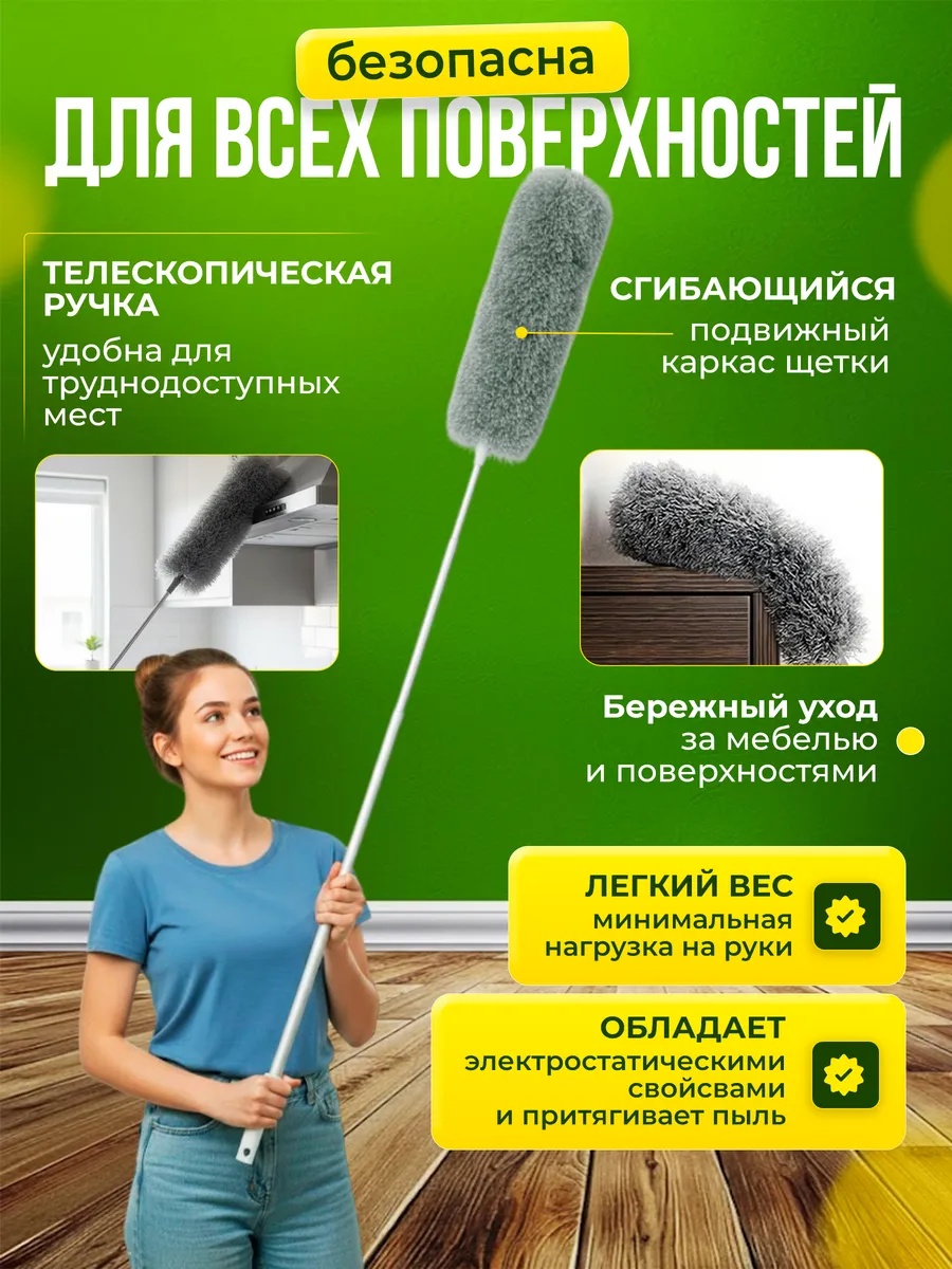 Антистатический ворс эффективно притягивает пыль, не разбрасывая её по комнате. Гибкая и длинная ручка избавляет от необходимости использовать стулья и лестницы, делая уборку безопаснее и комфортнее.