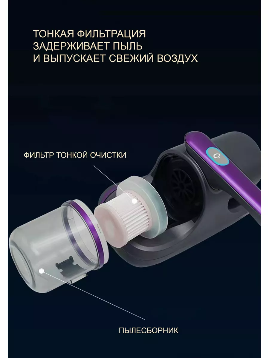 Высокоэффективный многофункциональный пылесос для кровати, дивана, простыни. Предназначен для удаления грязи, волос, шерсти, пылевого клеща и стерилизации поверхности. Пылесос борется с пылью, пылевыми клещами и другими микроорганизмами тремя способами: ультрафиолетовым излучением, вибрацией,всасыванием и тройной системой фильтрации.