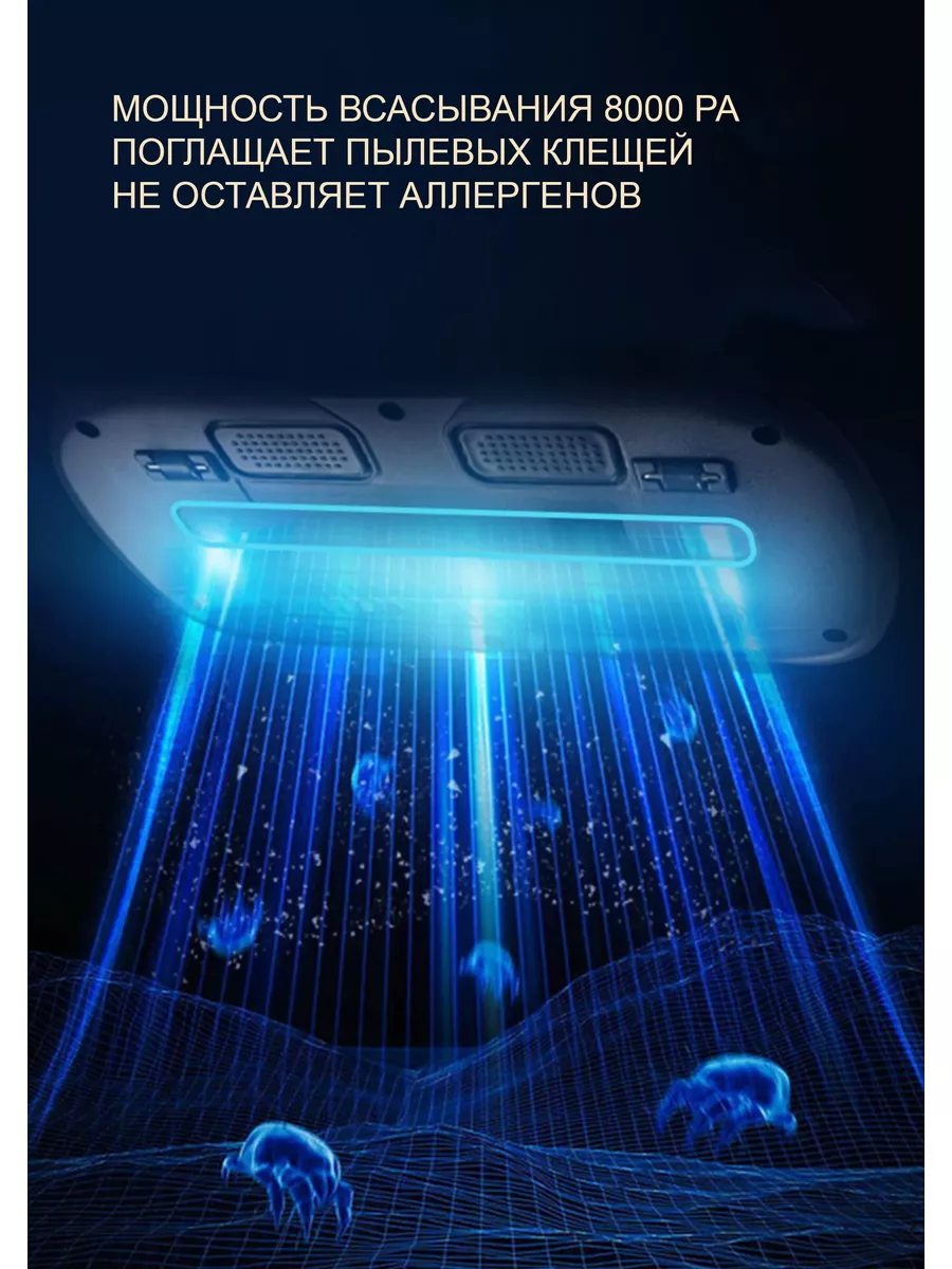Удаляется до 99 % клещей и обеспечивается 99.99 %-ная стерилизация поверхности. Мощный двигатель - мощность всасывания 8000 Па. Номинальная мощность 100 Вт. Высокоэфективная очистка - Специальный мотор выбивает пыль и засевших на глубине клещей.