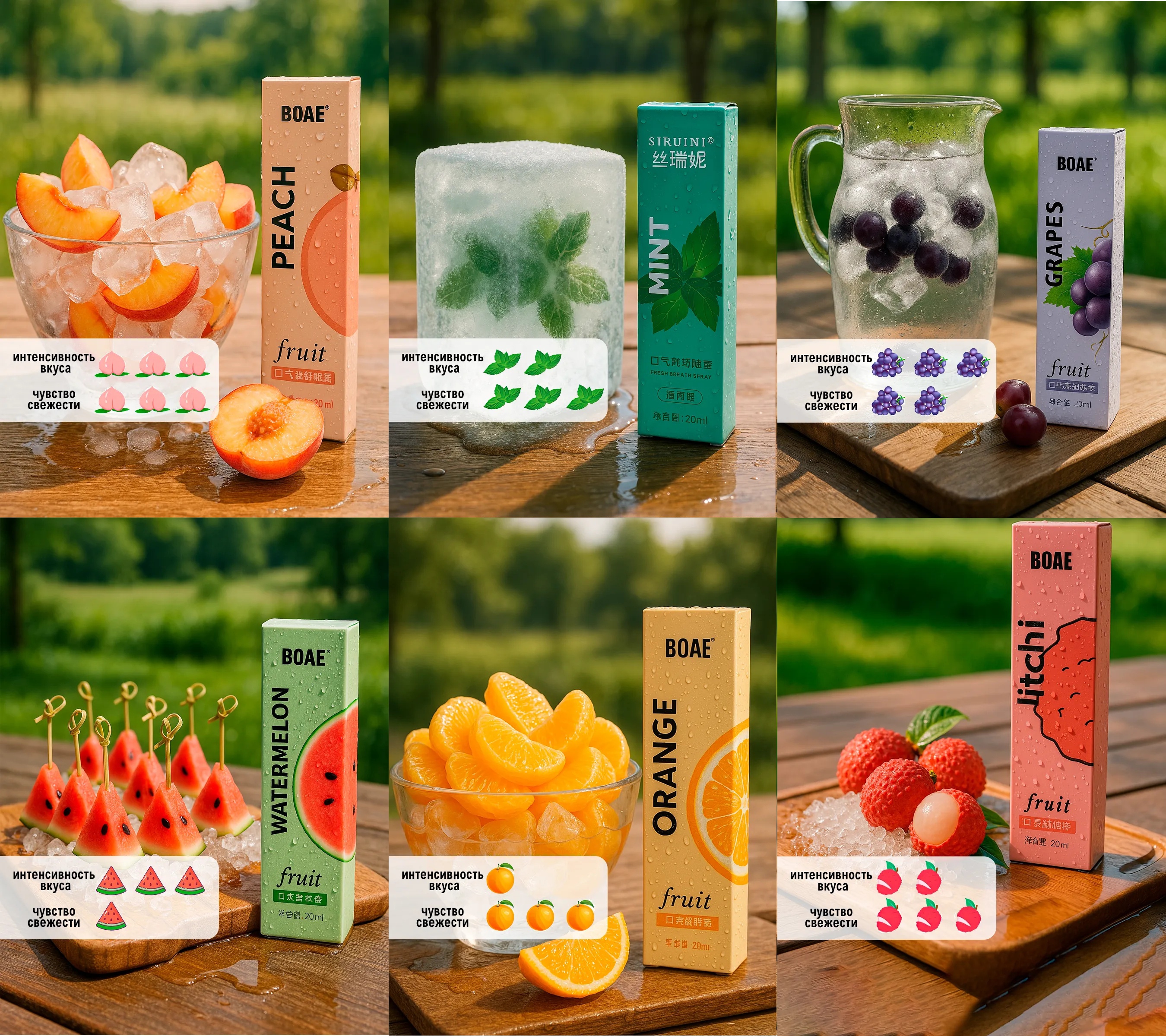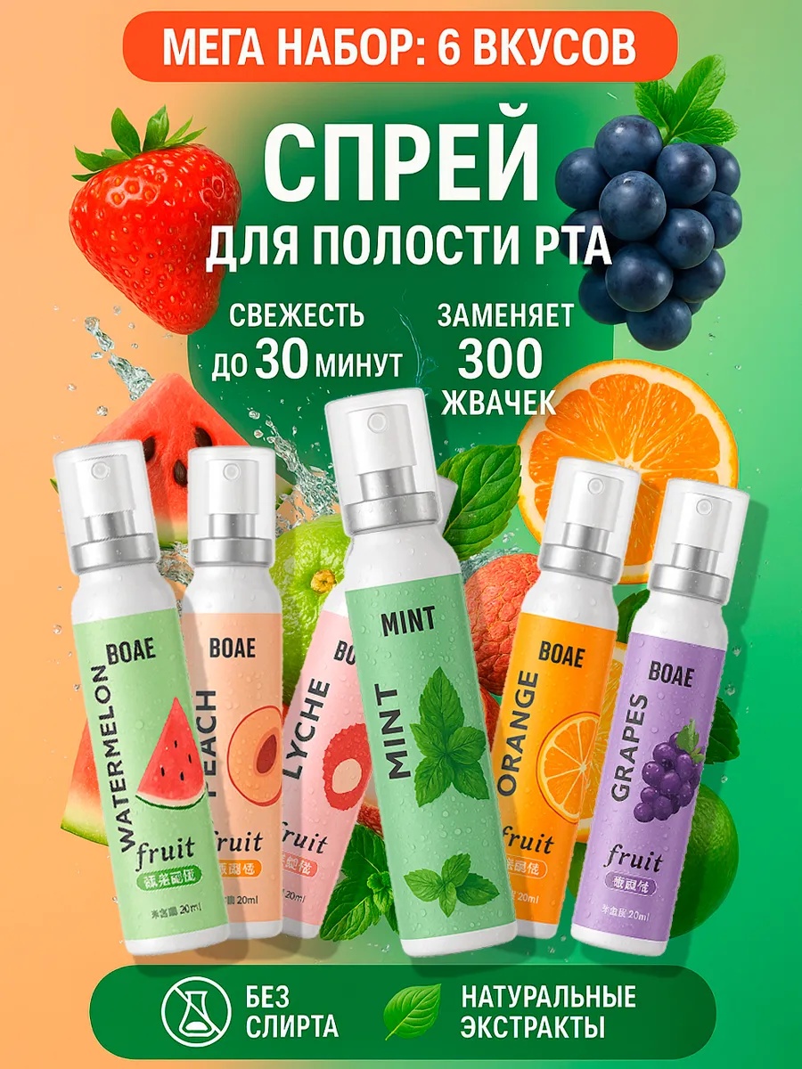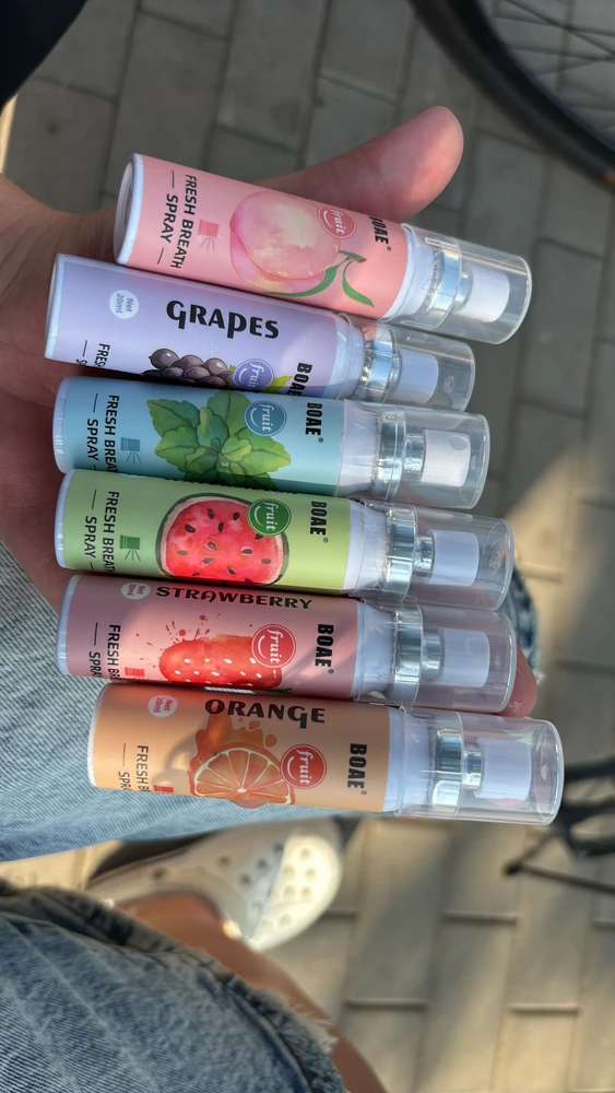 Освежители для рта BOAE — это стильное и удобное решение для поддержания свежего дыхания и гигиены полости рта. В набор входит 6 мини-спреев с разными вкусами: апельсин, личи, арбуз, виноград, мята и персик.
