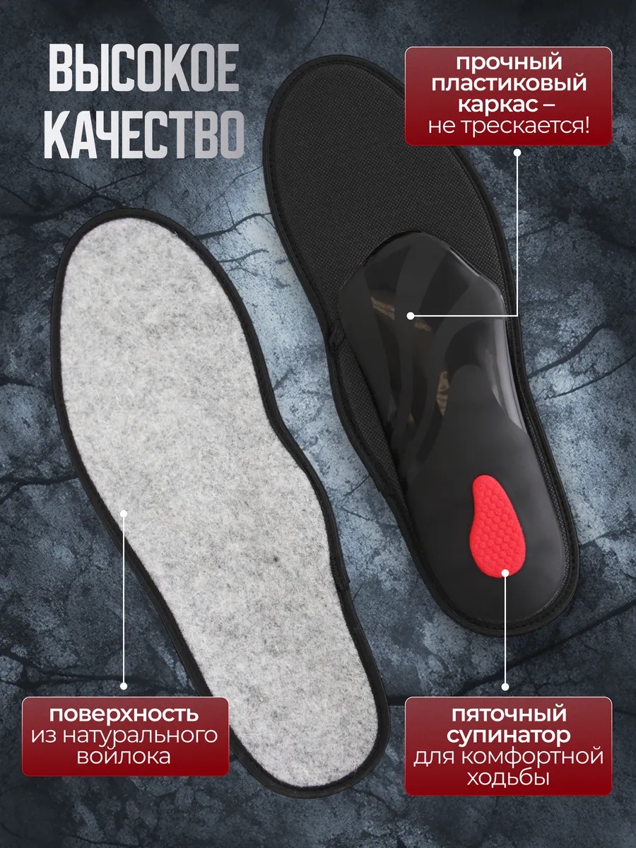 Каркас из прочного ABS-пластика поддерживает продольный и поперечный свод стопы, разгружает позвоночник и уменьшает давление при ходьбе. Мягкая латексная пена с угольным фильтром устраняет запахи и смягчает нагрузку при длительной ходьбе или занятиях спортом.