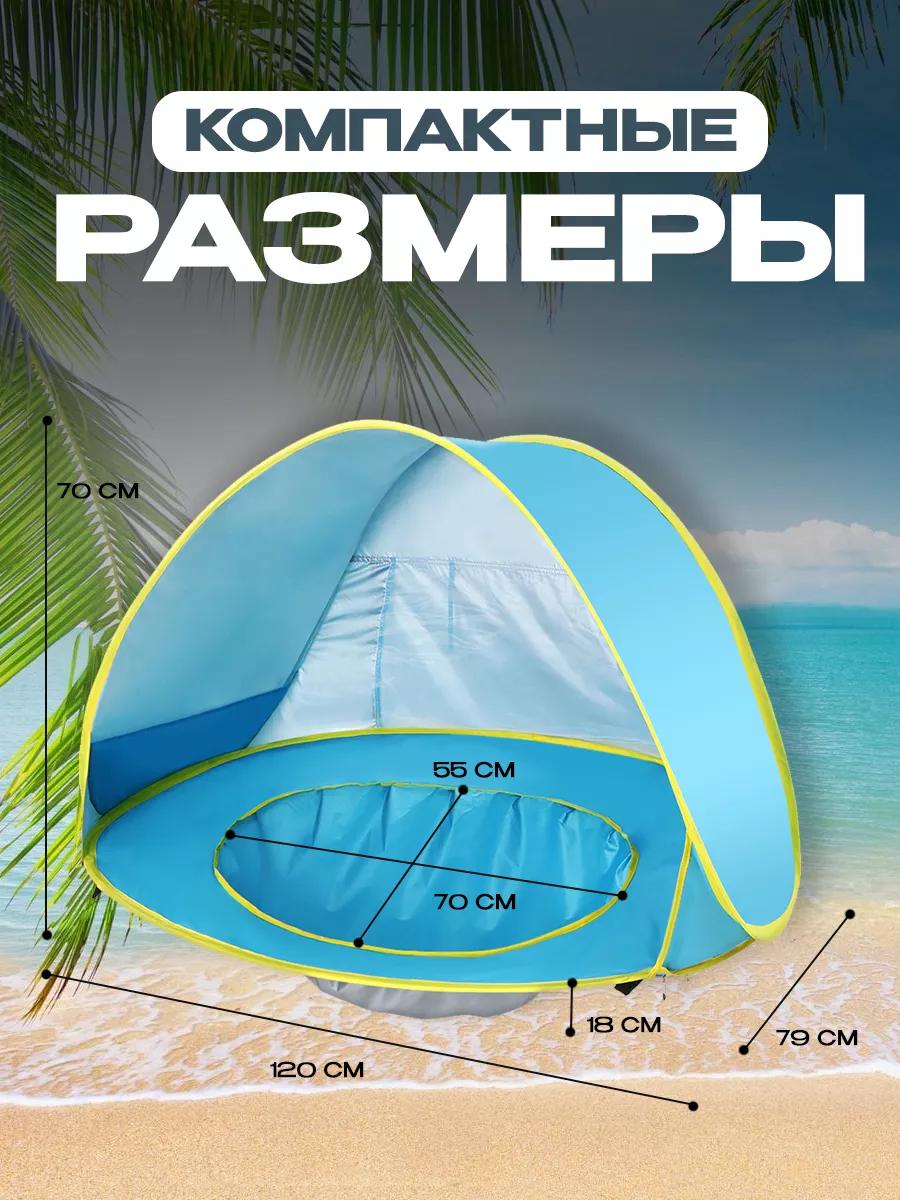 Бассейн в центре конструкции можно наполнить небольшим количеством воды, чтобы ребенок мог играть и наслаждаться прохладой под надежным укрытием. В сложенном виде палатка занимает минимум места и легко помещается в сумку-чехол.