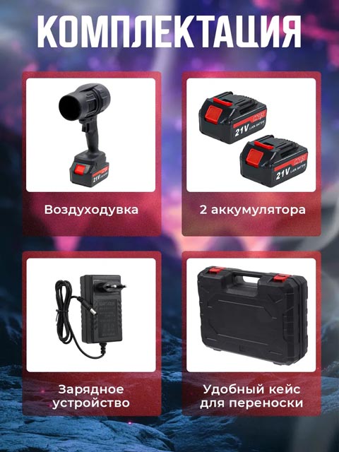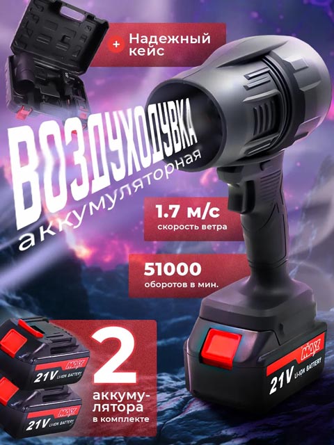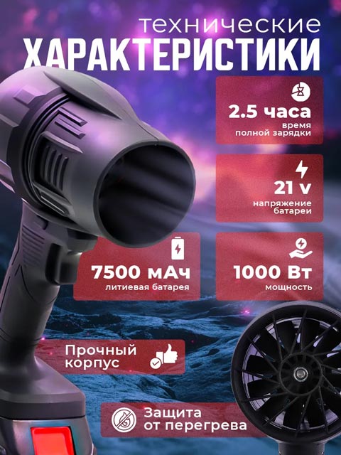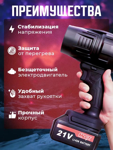 Аккумуляторы Li-Ion, идущие в наборе, работают без перерыва длительное время, а кейс из прочного пластика обеспечивает безопасное хранение и транспортировку воздушного девайса. Ручной воздуходув оснащен защитой от перегрева, что гарантирует долгий срок службы и надежную эксплуатацию. Мини размеры и небольшой вес гаджета делают его легким и удобным в использовании.