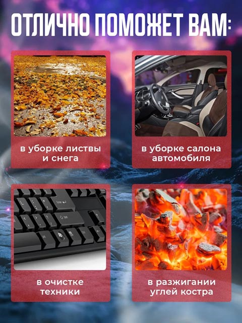 Забудьте о пыли, грязи и мусоре в вентиляторе ноутбука. Благодаря мощности ветродуйки, используйте электро товар для разжигания костра или углей в мангале. В зимний период обдувочный пистолет будет отличным компаньоном в очистки снега, а в осенний - листьев. Не упустите шанс обзавестись портативным электроинструментом, который упростит жизнь!