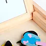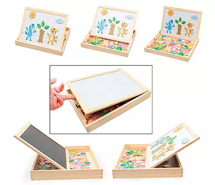 Магнитная игра «Funny Magnets» - это деревянная коробка с двухсторонней крышкой. На стороне с магнитной белой доской дети могут составлять различные сценки с магнитными фигурками, писать или рисовать маркером; черная доска предназначена для рисования мелом, написания заметок.