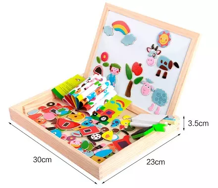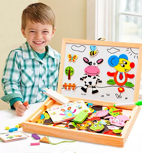 На белой магнитной стороне дети могут поиграть в пазлы с магнитом. Вдохновите детское творчество и фантазию. Отличная игрушка для дошкольника. Игрушка помогает изучать цвета, математику, формы и т.п. Хорошо развивает координацию рук и глаз.