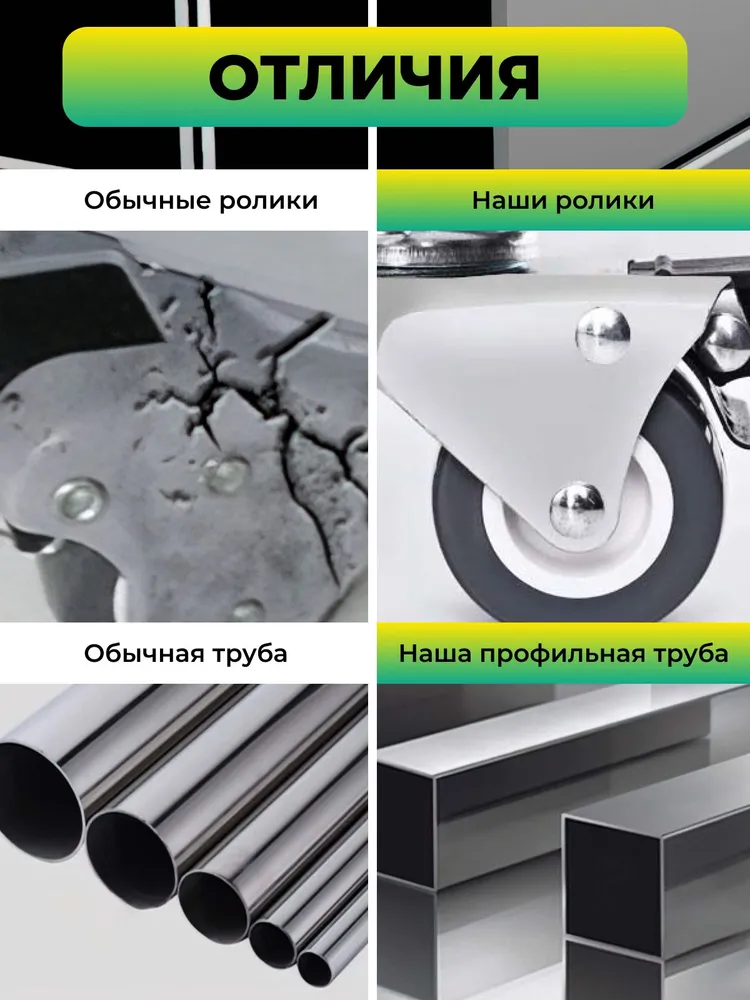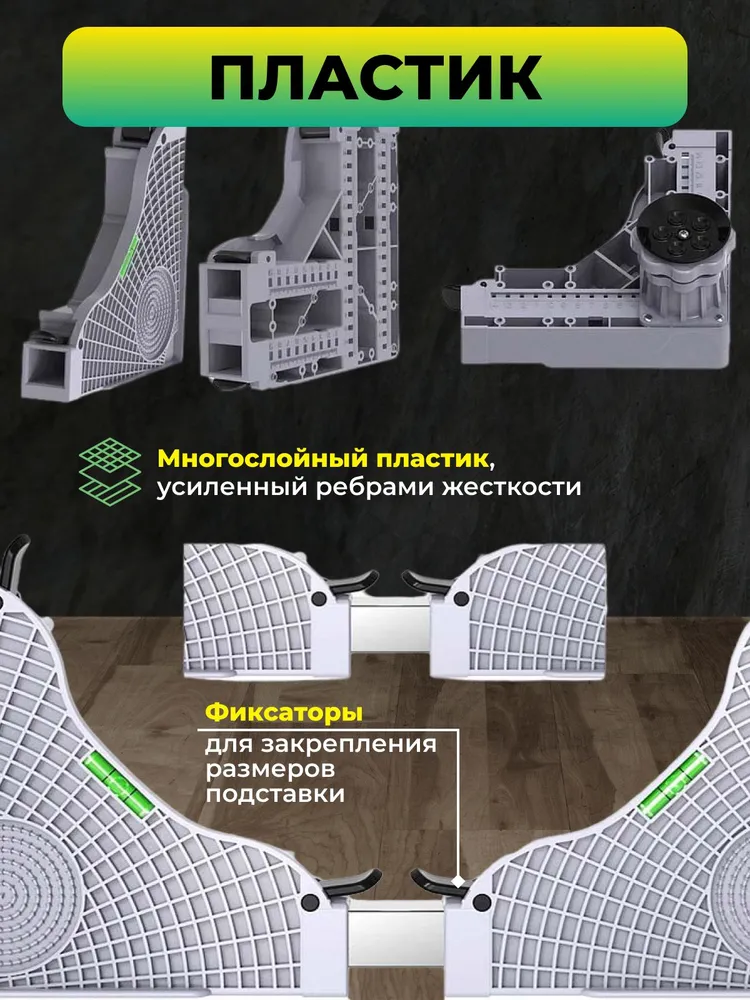 Прочная конструкция из металла и ударопрочного пластика выдерживает нагрузку до 200 кг, предотвращает скольжение и снижает вибрацию. Подставка регулируется по высоте и ширине, что позволяет адаптировать её под любую модель техники.
