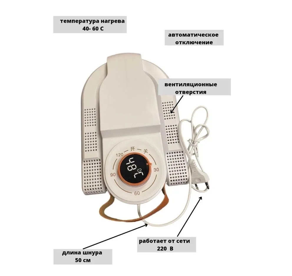 Оснащена встроенным таймером, который позволяет установить нужное время работы устройства. Максимальное время сушки составляет 120 минут, что делает ее удобной и безопасной для использования ночью или во время длительных отсутствий дома. Нагреватель с таймером имеет компактный и удобный дизайн, который позволяет легко хранить ее и использовать дома, в офисе или в путешествиях. Одним из главных ее преимуществ является сушка при температуре 48 градусов. Это оптимальный режим сушки для разных типов обуви. Она обладает простым и интуитивно понятным управлением, которое позволяет выбрать оптимальный режим для сушки разных типов обуви.
