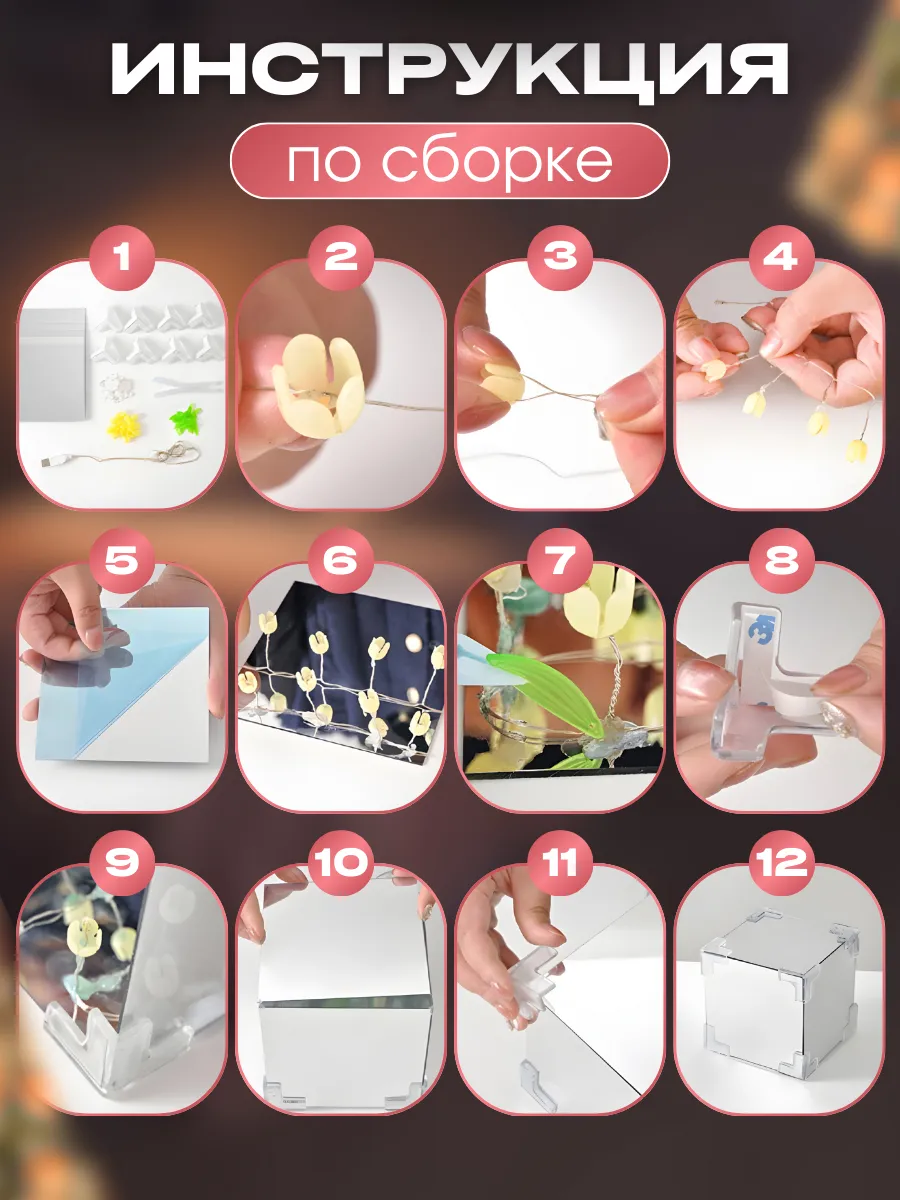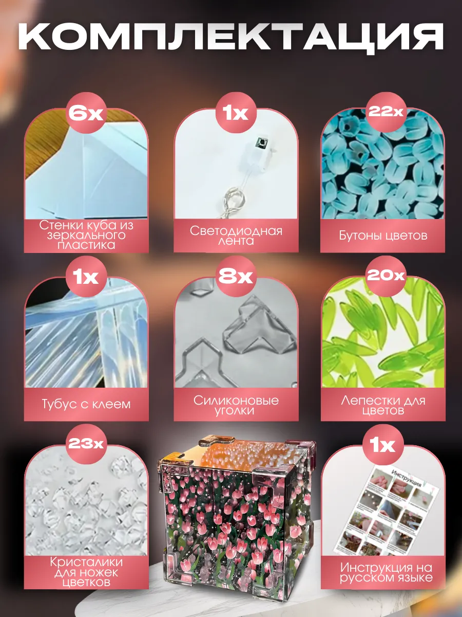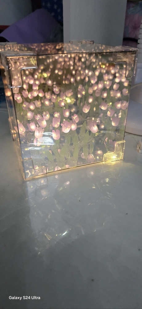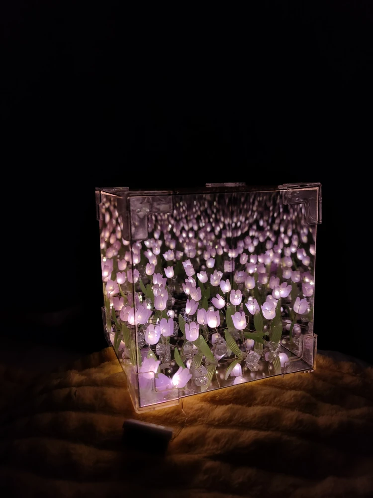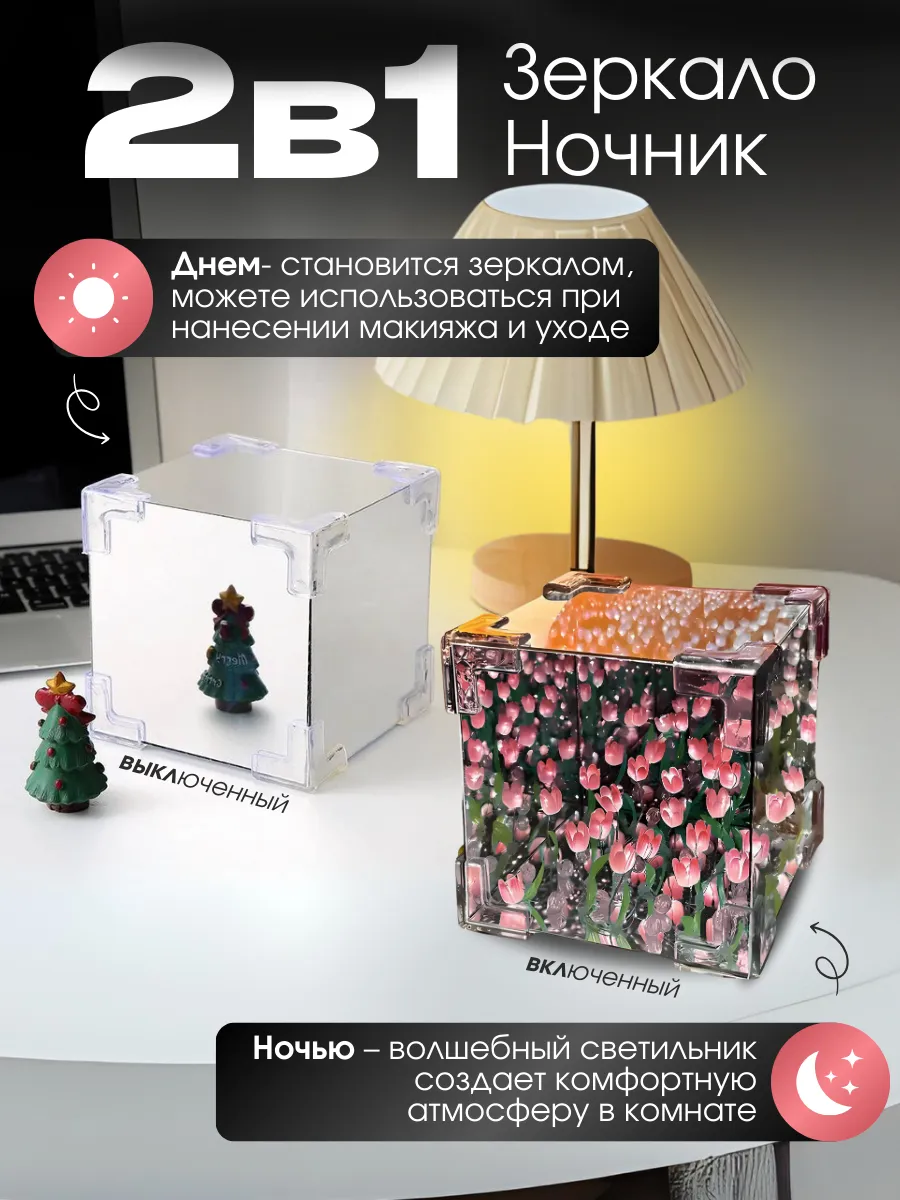 Подарите тепло и уют с оригинальным ночником "Бесконечные тюльпаны". Этот изысканный светильник в форме куба идеально впишется в интерьер спальни, гостиной или детской комнаты. Днём он служит стильным зеркалом, а ночью наполняет пространство мягким розовым светом, создавая атмосферу уюта и магии.